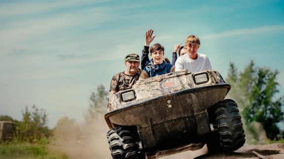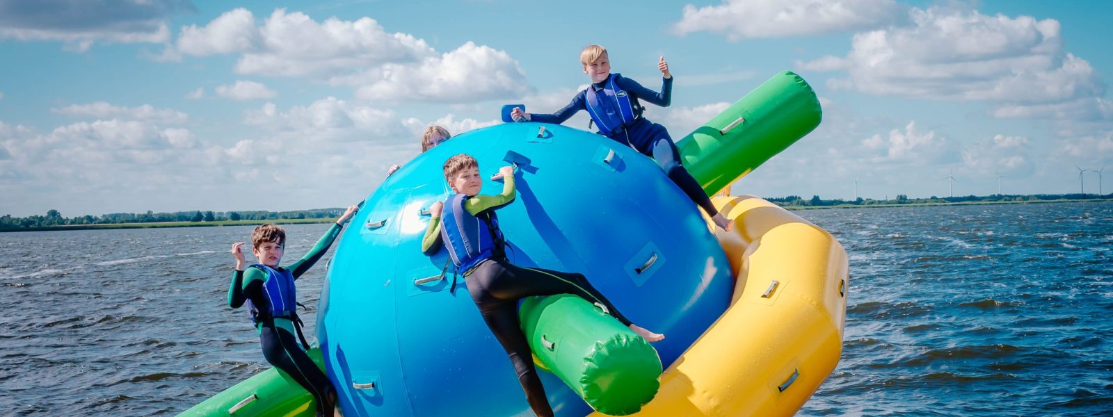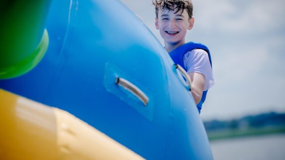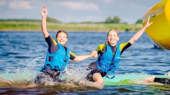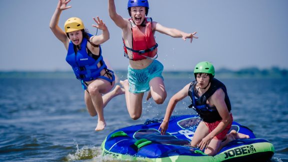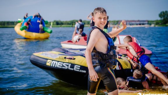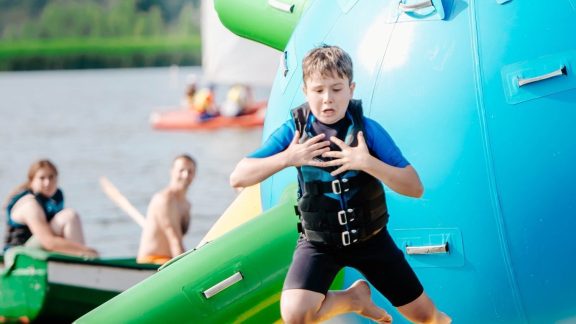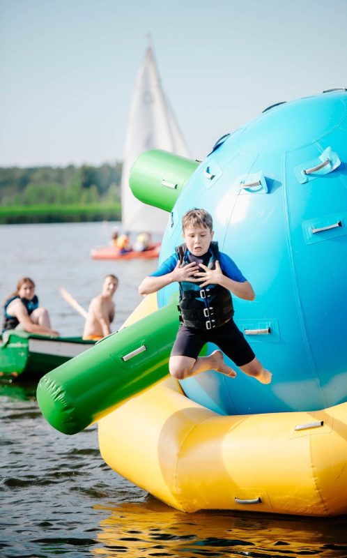 - Zabawa w naszym parku wodnym na jeziorze – dmuchany saturn, pływająca mata, dmuchany walec, NOWOŚĆ – 3 metrowa dmuchana zjeżdżalnia z skocznią do wody.