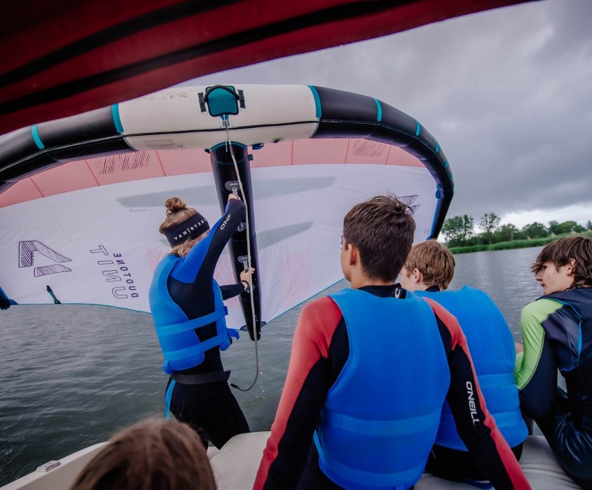 Zajęcia realizowane są z wykorzystaniem sprzętu motorowodnego z platformą szkoleniową, co umożliwia bezpieczne starty, lepszą kontrolę techniki i szybsze postępy na początkowym etapie nauki. Program dostosowywany jest do warunków wiatrowych i tempa grupy.
