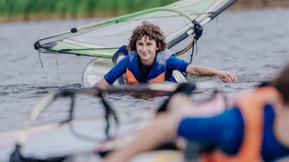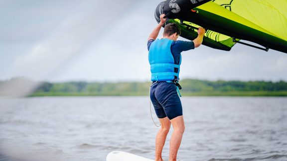 Początkujący: nauka od podstaw – balans i pozycja bazowa, obsługa żagla, pływanie na kursach względem wiatru, pierwsze zwroty i samodzielne manewrowanie deską.