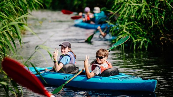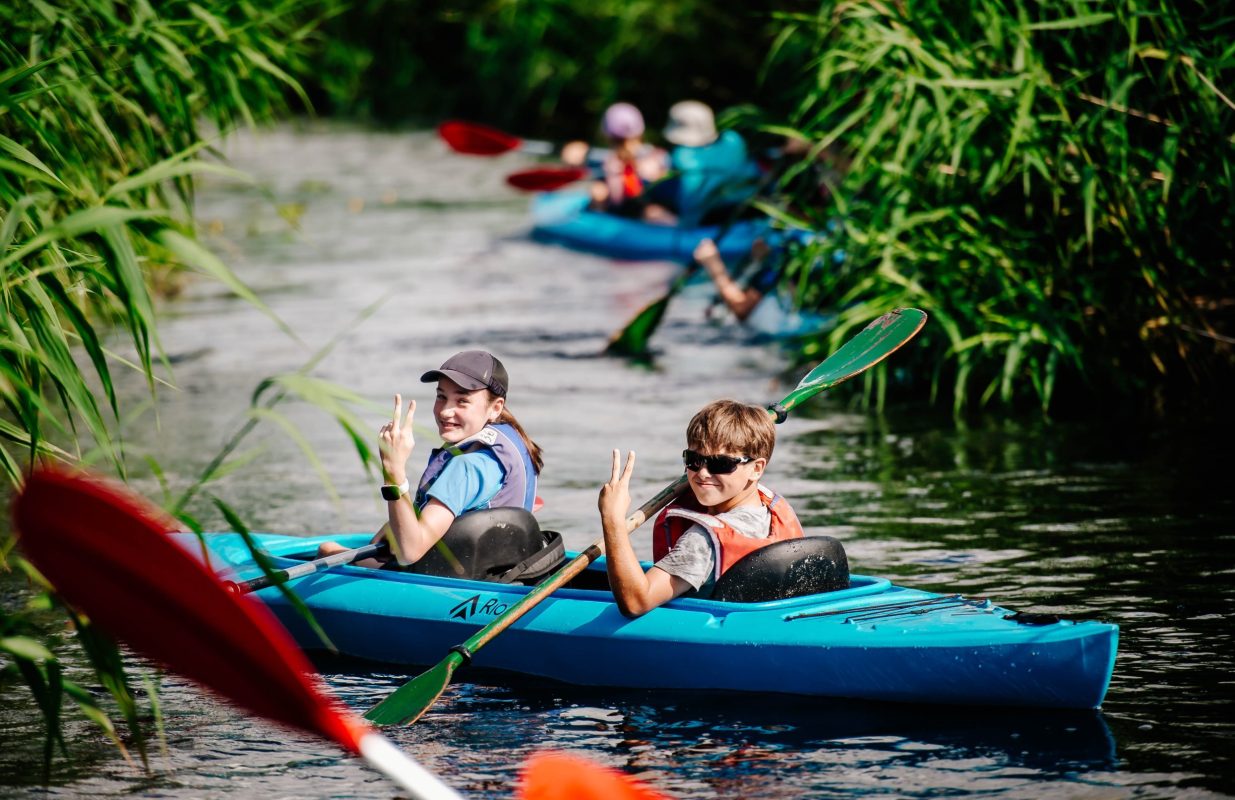 - Nauka pływania kajakiem, spływ kajakowy rzeką Błotnicą zakończony kolacją z ogniskiem i pieczeniem kiełbasek