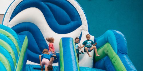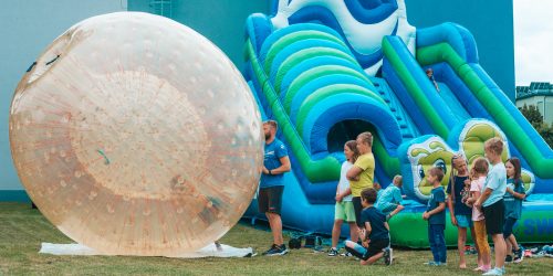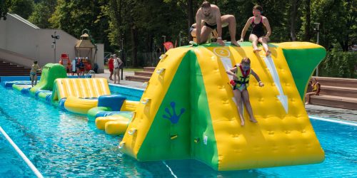 - Nowy dmuchaniec na wodę – 3 metrowa dmuchana zjeżdżalnia z skocznią do wody i ścianką wspinaczkową